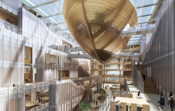 中國海洋大學西海岸校區(qū)圖書館,是騰遠2020年的創(chuàng)意之作。中庭七層頂部42米跨的鋼屋蓋,設(shè)有梭型鋼結(jié)構(gòu)“漂浮的船屋”,這個揚帆起航的震撼造型,如果沒有結(jié)構(gòu)設(shè)計師的幫助,最終只能成為空中樓閣,難以落地。但,孫紹東團隊就是問題的終結(jié)者,驚喜的創(chuàng)造者。