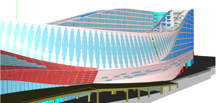 建筑設(shè)計為異形絲綢流線造型,結(jié)構(gòu)輔以大跨度鋼構(gòu)。因流線型造型給主體輪廓提出了更精準的要求,利用BIM技術(shù)根據(jù)幕墻模型確定各功能分區(qū)各層樓板邊界輪廓、及相關(guān)交界面,確保項目的美觀。