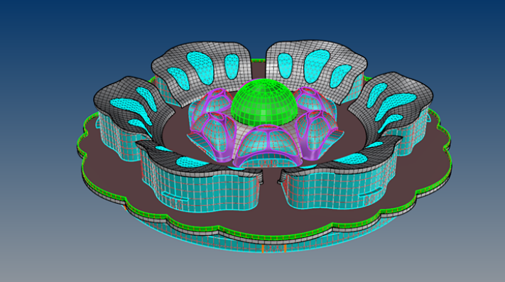 幕墻設(shè)計(jì)方面基于建筑和結(jié)構(gòu)模型搭建幕墻專業(yè)模型,形成初步分格方案;通過方案對(duì)比進(jìn)行幕墻系統(tǒng)論證分析;通過曲率分析進(jìn)行面板曲率優(yōu)化,形成最終分格方案。