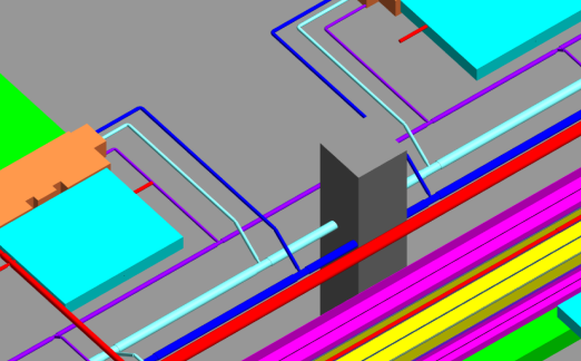 采用BIM軟件對提供的模型整體進(jìn)行碰撞檢測,導(dǎo)出碰撞報告,對存在的碰撞問題,進(jìn)行進(jìn)一步的模型深化,解決碰撞問題??芍苯訉⑵矫鎴D中出現(xiàn)的碰撞位置映射到三維視圖中,直觀地發(fā)現(xiàn)問題所在,并加以批注。由此省去了專業(yè)人員之間繁瑣的圖紙對照工作,節(jié)省大量人力物力和時間。