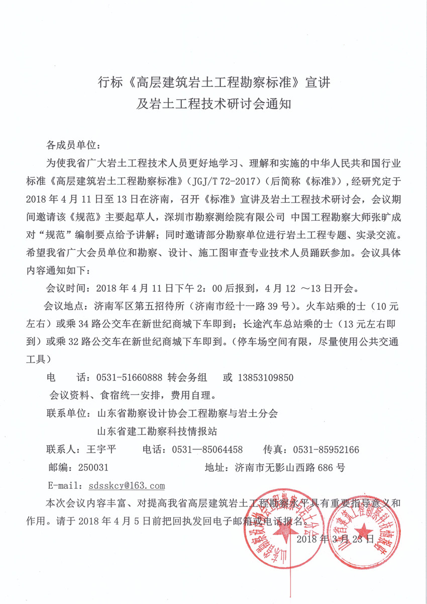本次會(huì)議內(nèi)容豐富、對提高我省高層建筑巖土工程勘察水平具有重要指導(dǎo)意義和作用。請于2018年4月5日前把回執(zhí)發(fā)回電子郵箱或電話報(bào)名。