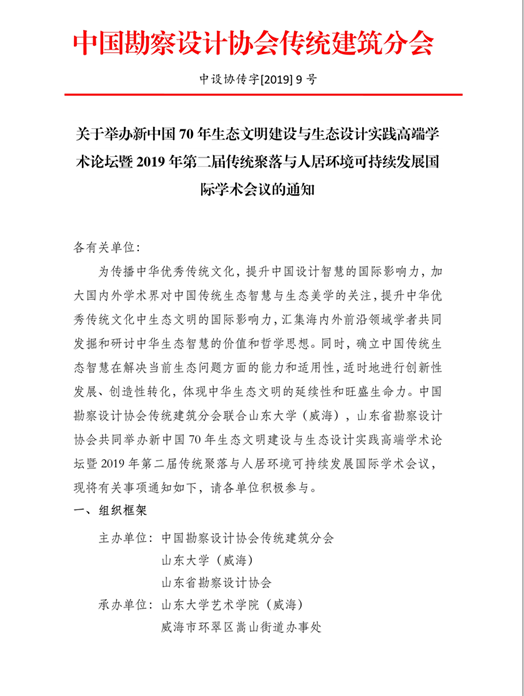 轉發《關于舉辦新中國70周年生態文明建設與生態設計實踐高端學術論壇暨2019年第二屆傳統聚落與人居環境可持續發展國際學術會議的通知》