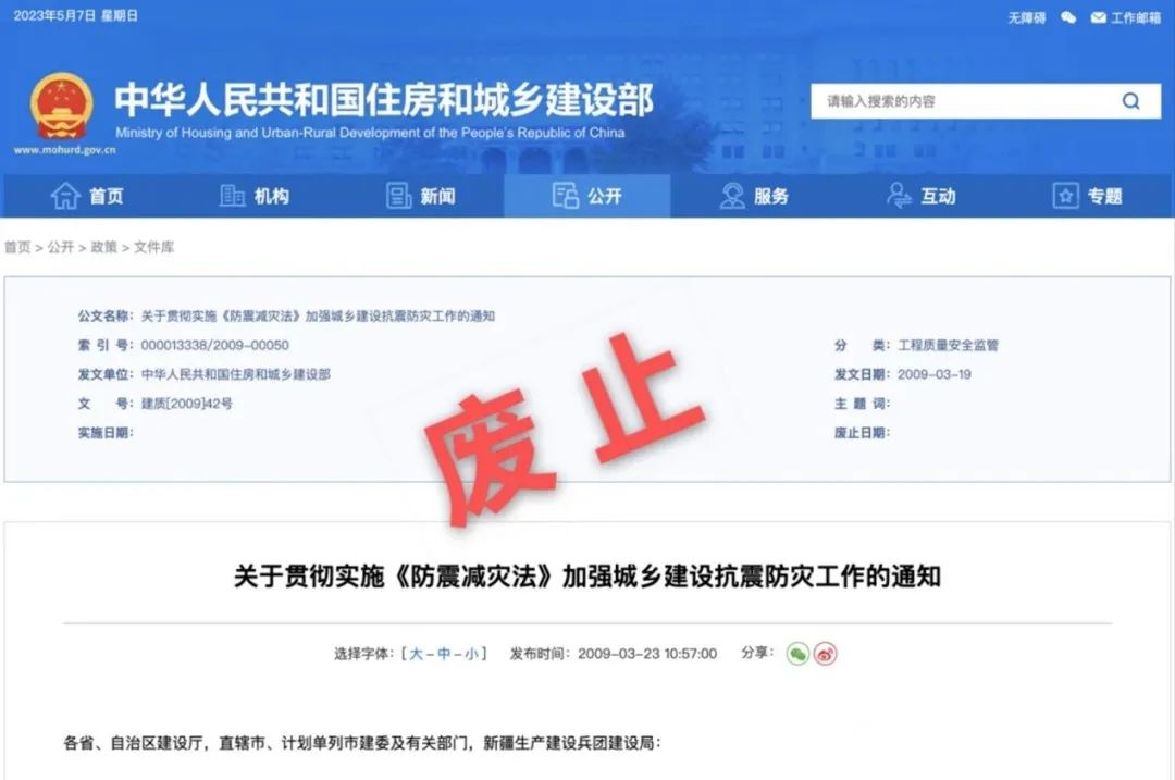 近日,住房和城鄉(xiāng)建設(shè)部印發(fā)《關(guān)于廢止和宣布失效部分行政規(guī)范性文件的公告》(住房和城鄉(xiāng)建設(shè)部公告2023年第58號),根據(jù)社會經(jīng)濟條件和制度環(huán)境變化,對有關(guān)行政規(guī)范性文件進行了集中清理。其中,《關(guān)于貫徹實施〈防震減災(zāi)法〉加強城鄉(xiāng)建設(shè)抗震防災(zāi)工作的通知》(建質(zhì)〔2009〕42號,以下簡稱《通知》),因上位法《建設(shè)工程抗震管理條例》(以下簡稱《條例》)的實施而被正式廢止。