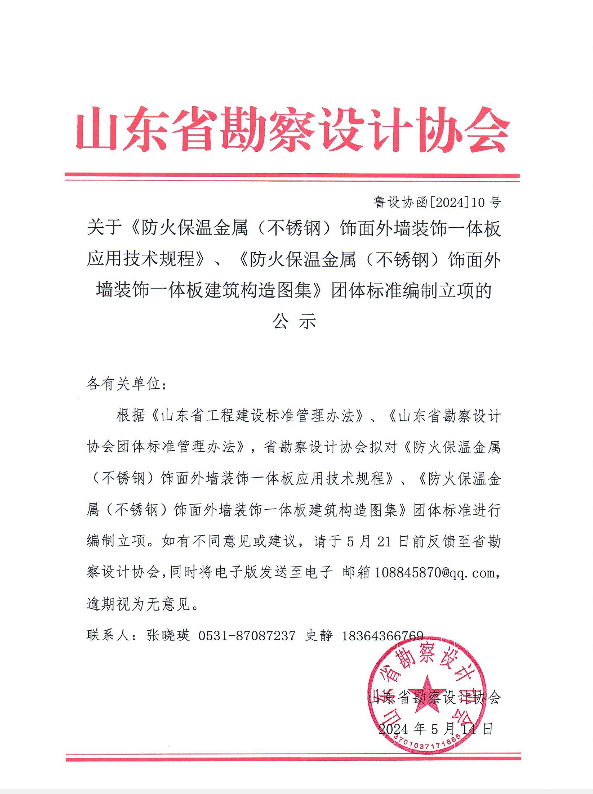 附件:關于《防火保溫金屬(不銹鋼)飾面外墻裝飾一體板應用技術規(guī)程》、《防火保溫金屬(不銹鋼)飾面外墻裝飾一體板建筑構(gòu)造圖集》團體標準編制立項的 公 示