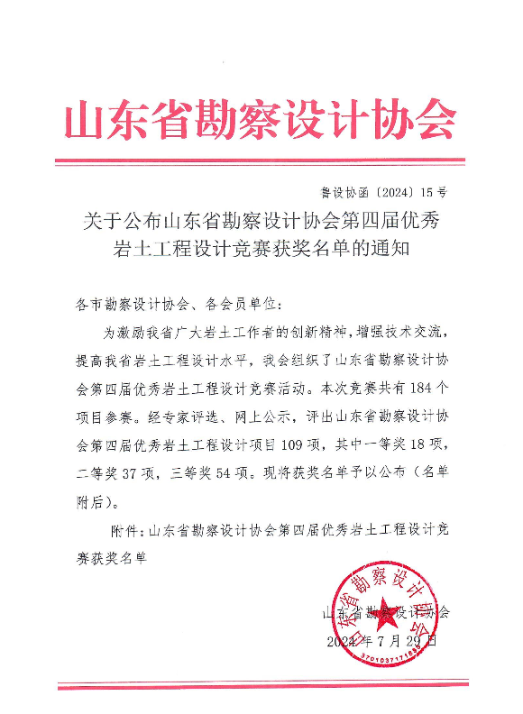 附件:關于公布山東省勘察設計協會第四屆優(yōu)秀巖土工程設計競賽獲獎名單的通知