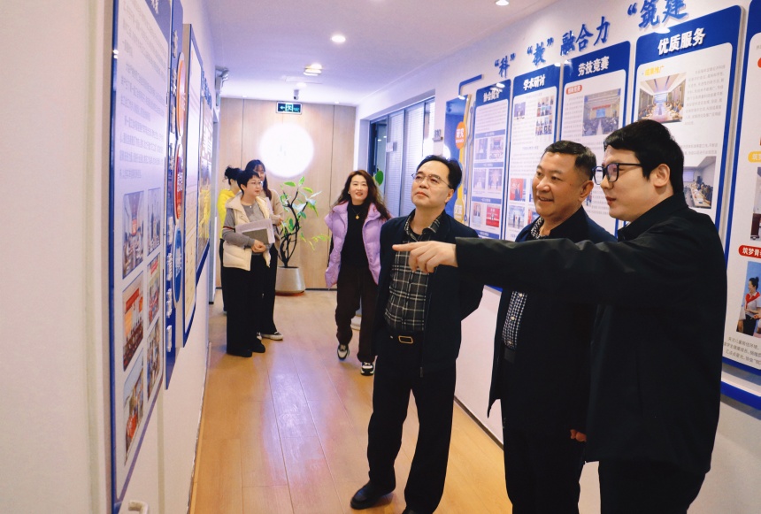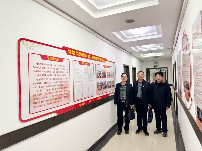 調(diào)研期間,在省勘察設(shè)計(jì)協(xié)會(huì)理事長(zhǎng)顧國(guó)棟、秘書長(zhǎng)單寶艷陪同下,劉躍奎教授參觀了協(xié)會(huì)黨建活動(dòng)室、黨建文化墻及協(xié)會(huì)文化宣傳欄。參觀過程中,協(xié)會(huì)負(fù)責(zé)人詳細(xì)介紹了在黨建陣地建設(shè)、特色文化培育以及成果宣傳方面的經(jīng)驗(yàn)與成效。與會(huì)人員還參觀了山東省建設(shè)科技與教育協(xié)會(huì)文化墻與宣傳欄,直觀感受協(xié)會(huì)黨建工作成果與行業(yè)發(fā)展特色。