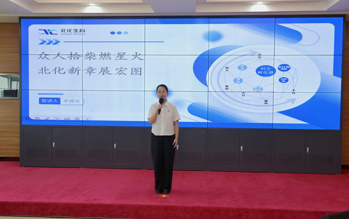 在首先舉行的“職工宣講比賽決賽暨先進事跡報告會”上,從預賽29名參賽者中脫穎而出的選手們,依次走上講臺,深情宣講扎根“三個北化”建設一線的鮮活故事。來自北化生科、華騰檢測、化研院、北搪公司的4名宣講員進行了精彩的宣講展示,他們生動講述了北化人面向生物醫藥新“藍海”的無畏拓進,在市場營銷、科研開發、信訪維穩等重點工作中攻堅克難的感人故事。來自技師學院、北普公司、北化房地產公司的3名宣講員進入決賽,他們或講述職業教育的酸甜苦辣、或反映現代產線的紛繁復雜、或展示酒店行業的微笑服務,娓娓道來的深情告白,無不體現出北化人心系首都發展安全、情系百姓健康幸福的錚錚誓言。
