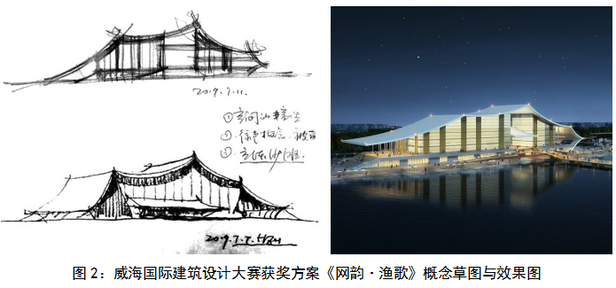 2019年的第十屆威海國際建筑設(shè)計大賽是侯朝暉帶領(lǐng)團(tuán)隊成員在生產(chǎn)任務(wù)縫隙中進(jìn)行的,盡管時間緊張,但最終完成四個方案,在沒有金獎的情況,依然斬獲銀獎、銅獎各一項,優(yōu)秀獎兩項?!毒W(wǎng)韻·漁歌》、《海草房印象》、《海天舞臺》、《樂海輕舟》四個方案風(fēng)格各異,但都基本體現(xiàn)了海洋的環(huán)境特色和漁家文化的地域背景。