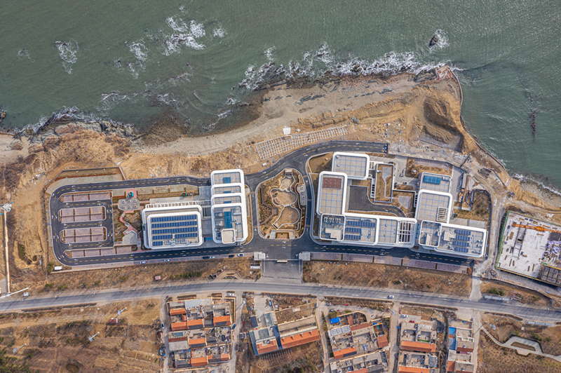 設計取意于“礁石上生長的貝殼”。建筑形體盡可能保留與自然岸線的退臺與嵌合關系,立面上搭配的白色水平層檐造型,如浪花般舒展悠揚,襯托在藍灰色的墻體之間,型體光影豐富、色彩輕盈、流動變幻,創(chuàng)造了海洋類科研建筑獨特的地域表情。使得建筑如“貝殼”般嵌入海邊的礁石,錯落地生長在基地之中。
