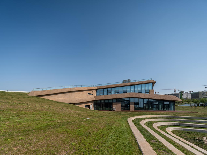 在基地中心的景觀濕地水面,設置了一處“水準原點”。 將七個科研平臺、十一個研究中心組成的科研綜合體建筑,沿著“原點”螺旋擴展發(fā)散,形成了規(guī)劃布局中的空間圖底關系。